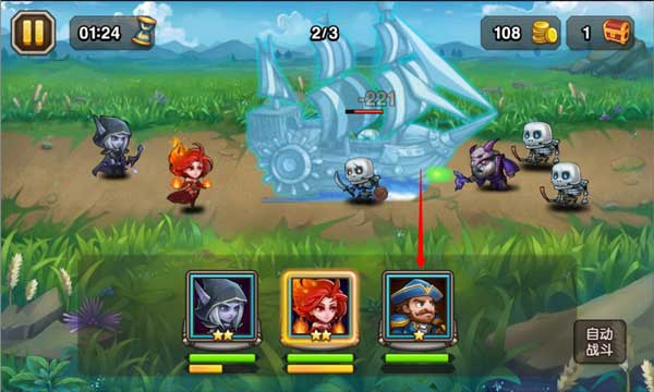 当能量条蓄满时,英雄头像会亮起。点击发光的头像(如“船长”),即可对敌人发动致命一击。